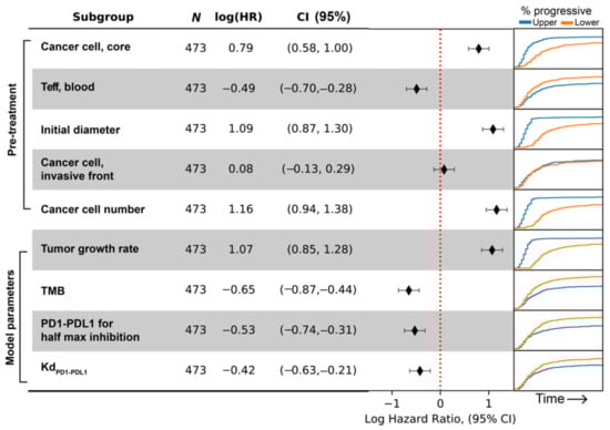 Assessment of relationships between variables from the first and the third category, i.e., between treatment endpoints and biomarkers, also has tremendous clinical value. In this study, we demonstrated the methods of performing biomarker analysis on different types of outcomes, including continuous, categorical, and time-to-event endpoints. However, in those analyses, we did not take into account possible nonlinear effect of biomarkers or interactions between them. Additionally, during the example of subgroup analysis, we use median value of each parameter/biomarker to dichotomize the virtual cohort, which can result in suboptimal grouping. In future studies, biomarker and subgroup analysis can be further strengthened by using statistical models with nonlinear and interaction terms, and also more sophisticated subgroup identification methods [72].