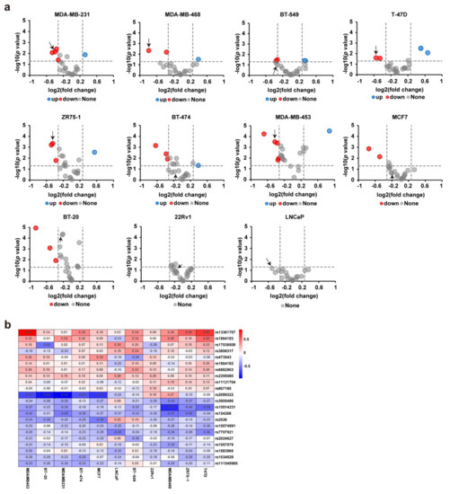 Parallel reporter gene assays identify multiple regulatory SNPs. (a) The DiR-seq reporter gene assay for the 22 risk SNPs in nine breast cancer cells and two prostate cancer cells. Red points represent SNP sites with decreased regulatory activity for the risk allele (risk/protective <0.8, p < 0.05), and blue points represent SNPs with increased activity for the risk allele (risk/protective >1.2, p < 0.05). The p values were assessed using a two-tailed Student’s t-test. The point highlighted with the arrow is rs10514231. (b) Heatmap showing the gene regulation activity of the 22 SNPs in breast cancer cells, annotated values are log2 (risk/protective).