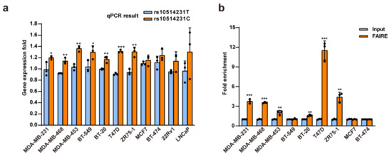 We then explored the biological function of the rs10514231 alleles systematically. Firstly, we verified the reporter expression level of the two alleles by RT-qPCR (Figure 2a). Consistent with the DiR-seq analysis, the protective C allele showed higher activity than the risk T allele. Active regulatory elements usually have higher chromatin open status on the genome, and hence the chromatin open state has become an important indicator for gene regulation elements [13]. We performed formaldehyde-assisted isolation of the regulatory elements (FAIRE) assay followed by qPCR analysis to determine the open status of the rs10514231 region. The results showed that the rs10514231 site was significantly enriched in the open chromatin fraction in the breast cancer cell lines in which the SNP showed regulatory activity (Figure 2b). This evidence indicates that the rs10514231 locus is an essential gene regulatory element in breast cancer cells.