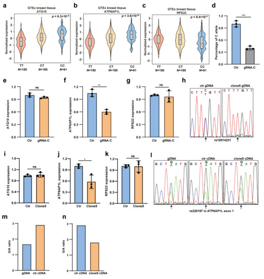 Rs10514231 regulates gene expression of ATP6AP1L. (a–c) The eQTL analysis from the GTEx database showing the association between the rs10514231 genotype and expression of ATG10, ATP6AP1L, and RPS23 in normal breast tissues. (d) CRISPR/Cas9-mediated C allele-specific genome editing on the rs10514231 site in MDA-MB-453 cells. The remaining level of the C allele was determined by the getPCR method. Values are the means ± SD; * p < 0.05, two-tailed Student’s t-test. (e–g) Gene expression level of the three target genes, ATG10, ATP6AP1L, and RPS23, in MDA-MB-453 cells edited with C allele-specific gRNA. Gene expression level determined by RT-qPCR. Values are the means ± SD; ** p < 0.01, ns = not significant, two-tailed Student’s t-test. (h) Sanger sequencing chromatogram of the rs10514231 region in clone 5, a T/T genotype MDA-MB-453 cell line, originated from the C allele-specific genome editing. (i–k) Gene expression level of the three eQTL genes in the clone 5 cell line, analyzed through RT-qPCR. Values are the means ± SD; * p < 0.05, ns = not significant, two-tailed Student’s t-test. (l) Sanger sequencing chromatogram of rs226197 in ATP6AP1L exon 1 in genomic DNA and cDNA of the clone 5 cells and original MDA-MB-453 cells. The altered relative peak height represents the allele-specific expression of the ATP6AP1L gene. (m,n) The under-peak area of the G and A allele in the Sanger sequencing chromatogram quantified by EditR 1.0.9 online software (https://moriaritylab.shinyapps.io/editr_v10/, accessed on 14 October 2020).