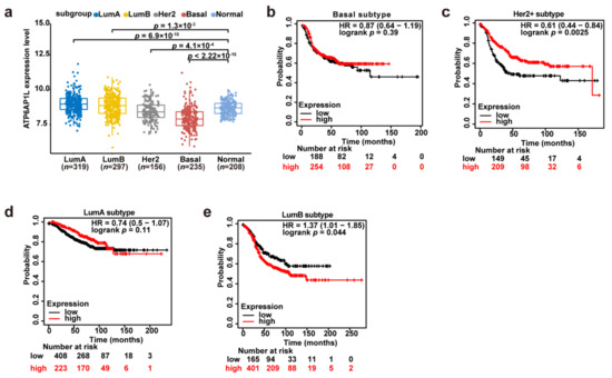 We next investigated the clinical impact of ATP6AP1L expression on breast cancer progression. Notably, we found that the ATP6AP1L expression level was significantly lower in the basal-like and Her2+ breast cancer samples than in normal samples (Figure 4a). We performed a survival analysis on the different subtypes of breast cancer patients from the Kaplan–Meier plotter database [25] and found that the recurrence-free survival time was longer for patients with higher ATP6AP1L expression levels in most subtypes, such as the basal-like, Her2+, and LumA subtypes (Basal: HR = 0.87, 95% CI, 0.64–1.19, log-rank p = 0.39; Her2+: HR = 0.61, 95% CI, 0.44–0.84, log-rank p = 0.0025; LumA: HR = 0.74, 95% CI, 0.5–1.07, log-rank p = 0.11; and LumB: HR = 1.37, 95% CI, 1.01–1.85, log-rank p = 0.044) (Figure 4b–e). It suggests that the ATP6AP1L gene might function as a suppressor in breast cancer progression, except for the LumB subtype breast cancer.
