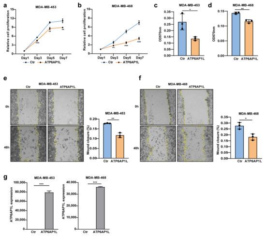 Since the SNP rs10514231 showed regulatory activity in the TNBC and LumA subtype cell lines, as shown in Figure 2a, we further tested the effect of the ATP6AP1L gene on the cancerous genotypes on two TNBC cell lines, MDA-MB-468 and MDA-MB-453, and on the LumA cell line T47D. We found that lentiviral vector-mediated ATP6AP1L gene overexpression significantly inhibited cell proliferation for MDA-MB-453, MDA-MB-468, and T47D cells (Figure 5a,b and Figure S3a). The colony-forming assay also showed that ATP6AP1L overexpression significantly impeded the cancer cells’ ability to survive and form colonies in MDA-MB-453 and MDA-MB-468 cells (Figure 5c,d), and ATP6AP1L overexpression showed the same impact in T47D cells despite no significance (Figure S3b). In addition, cell migration ability is another vital cancerous feature associated with tumor metastasis. Our wound healing assays indicated that lentiviral overexpression of ATP6AP1L in MDA-MB-453, MDA-MB-468, and T47D cells significantly suppressed cell migration ability (Figure 5e,f and Figure S3c). The overexpression of the ATP6AP1L gene in MDA-MB-453, MDA-MB-468, and T47D cells was confirmed through RT-qPCR analysis, as showed in Figure 5g and Figure S3d.