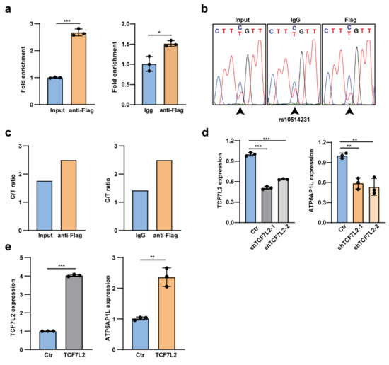 It has been widely known that the risk SNPs usually a exert gene regulatory effect through altering the chromatin binding of a given transcription factor [14,26,27]. Hence, it is of great importance to disclose the potential transcription factor that binds the rs10514231 SNP region and regulates the ATP6AP1L gene. Our investigation with the online tool HaploRegv4.1 [28] and JASPAR showed that the rs10514231 site might alter the chromatin binding of TCF7L2 (also known as TCF4). To verify this finding, we performed a chromatin immunoprecipitation (ChIP) assay using anti-Flag antibody in MDA-MB-453 cells overexpressed with N-terminal Flag-tagged TCF7L2. The ChIP-qPCR analysis showed that the rs10514231 region was significantly enriched in the TCF7L2 ChIP DNA (Figure 6a).