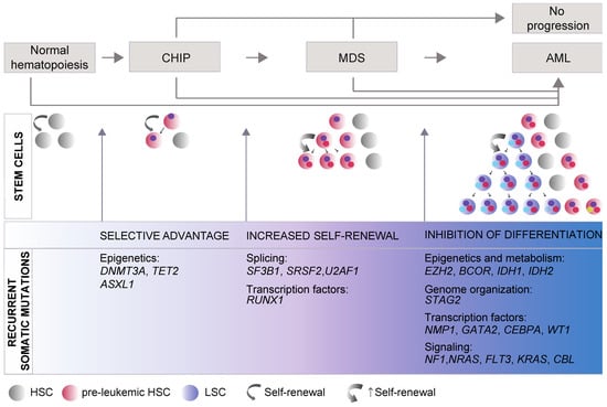 MDS entails both molecular and cytogenetic complexity. Early studies and more recent analysis through whole-genome sequencing of somatic mutations in MDS patients identified more than 50 recurrently mutated genes. These genes can be broadly divided into a few main categories controlling basic cellular functions: (1) transcriptional and epigenetic control of gene expression; (2) RNA splicing; (3) genome integrity; and (4) signal transduction pathways. Notably, only six genes are most frequently mutated and found in at least 10% of patients with MDS: DNMT3A, TET2, ASXL1, SF3B1, SRSF2, and RUNX1 [,,]. These studies also pointed to major mutation-driver genes acquired in each of the phases during the course of the disease, from initial clonal hematopoiesis (CH), characterized by the presence of HSC/hematopoietic precursors carrying somatic mutations, through to development of MDS and eventually progression to AML (Figure 1), suggesting that CH–MDS–AML development constitutes a continuous evolutionary process.