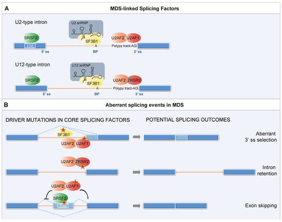 Splicing factors mutations in MDS. (A) Physiological role of MDS-linked SFs in spliceosome assembly. Intron removal requires the recognition of regulatory RNA sequence motifs by core components of the spliceosome followed by cleavage at conserved sequences called splice sites at the 5′ and 3′ ends of the introns (5′ ss and 3′ ss). Another important sequence is located 18–40 nucleotides upstream from the 3′ end of an intron. This sequence, termed the branch point (BP), always contains an adenine, but it is otherwise loosely conserved. Splice site recognition additionally requires Exonic Splicing Enhancers (ESEs). ESEs participate in both alternative and constitutive splicing, and many of them act as binding sites for members of the SR protein family, among which SRSF2. U1, U2, U4/U6, and U5 snRNPs are fundamental for the recognition of the splice sites and in the catalysis of the splicing reaction. Each of the five snRNPs contains one small nuclear RNA (snRNA) and a number of protein components. The initial intron recognition is achieved by U1 snRNP, which binds to the 5′ ss through base-pairing between the 5′ ss and the 5′ end of U1 snRNA, and by the interaction of splicing factor 1 (SF1/mBBP) with the BP; the 3′ ss is bound by the U2 auxiliary factor U2AF (U2AF1/2 heterodimer). Subsequently, SF1 is displaced and U2AF recruits the U2 snRNP, in which the multi-protein component SF3b harbors the subunit SF3B1, to the BP sequence, forming the pre-spliceosome. The pre-spliceosome then associates with the preassembled U4/U6.U5 tri-snRNP and after several rearrangements gives rise to the catalytically active spliceosome. In addition to the major U2-dependent spliceosome, most metazoans contain a second distinct pre-mRNA splicing machinery called the minor (U12-dependent) spliceosome. U12-type introns account for less than 0.5% of all introns in any given genome and are enriched in specific gene families, such as the mitogen activated-protein kinase, voltage-gated sodium and calcium ion channels, and E2F transcription factors []. ZRSR2 is a U2AF1-related protein that interacts with U2AF2 and is required for the recognition of the minor introns’ 3′ ss. (B) Aberrant alternative splicing events caused by the MDS-linked SFs’ mutations. Mutations in different SFs result in distinct mechanistic alterations in splicing. SF3B1 and U2AF1 mutations mainly alter 3′ ss selection through recognition of a cryptic 3′ splice site, and enhance aberrant exon inclusion through the selection of non-canonical BPs. Aberrant splicing caused by ZRSR2 mutations primarily consist in intron retention. Finally, SRSF2 mutations alter its ability to recognize a splicing enhancer motif, resulting in the majority of cases in exon skipping.