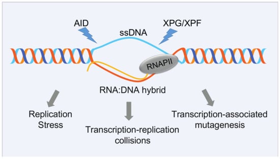 R-loops are three-stranded nucleic acid structures that form during transcription consisting of an RNA:DNA hybrid and a complementary displaced strand of DNA (Figure 3). While R-loops have regulatory roles in many physiological processes, unscheduled R-loops are a source of endogenous DNA damage since the displaced single-stranded non-template strand would be exposed to lesions or to processing by endonucleases. R-loop features have been extensively discussed in recent excellent reviews [,]. In addition, R-loops can interfere with DNA replication, leading to the stalling of the replication fork. Replication stress usually results in accumulation of stretches of exposed single-stranded DNA that can be processed to DNA double-strand breaks (DSBs). Thus, by impacting on DNA dynamics, R-loops constitute a threat to genome integrity [,,] and, as such, they could exert selective pressure on preleukemic/CHIP clones and drive cancer progression [,,].
