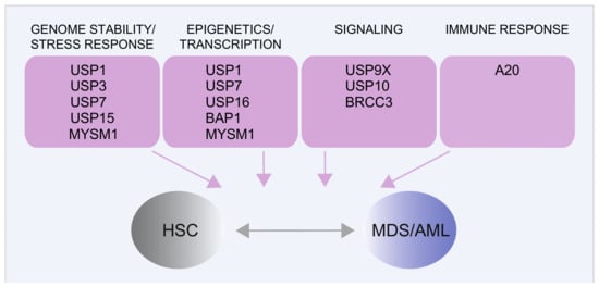 DNA damage can originate in HSCs from both endogenous sources, including transcriptional, replicative, and oxidative stress, as well as from environmental or therapy related challenges [,,,], as exemplified by topoisomerase II treatment, which frequently induces balanced translocations involving the MLL (mixed lineage leukemia) gene on chromosome 11q23, associated with therapy-related AML [,]. Two novel emerging players in maintaining genomic stability, corrupted in LSCs, are the regulation of R-loops formation associated with mutations in splicing factors and the modulation of (DDR) ubiquitination pathways by deubiquitinating enzymes.