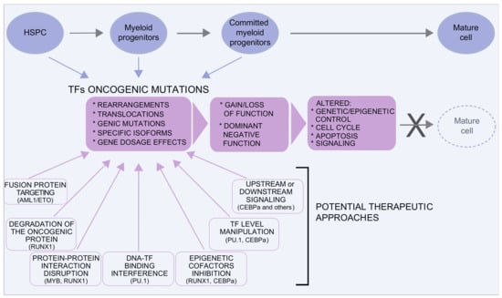 In this review, we do not aim to provide a full list of the TFs involved in myeloid transformation but only to illustrate the above mechanisms focusing on representative examples.