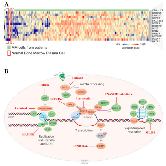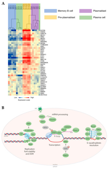 Our group developed a multi-step cell culture system to model B-cell to PC differentiation where various combinations of cytokines and activation molecules are needed to reproduce the sequential PC differentiation steps occurring in the different organs/tissue in vivo [11,12,13]. MBCs differentiate into pre-plasmablasts (prePBs), plasmablasts (PBs), early PCs, and finally, long-lived PCs that produce high Ig amounts [11,12,13]. PrePBs have been identified in human lymph nodes, tonsils, and bone marrow [12,14]. This transitional stage is characterized by the absence of both B-cell and PC markers. In particular, at this stage, DNA replication and transcription rates dramatically increase since prePBs start to produce large amounts of Igs and still have a high proliferation rate [12,15], a unique situation possibly prone to give rise to increased TRCs. Therefore, a tight regulation between transcription and replication at this step is critical to avoid unscheduled DNA breaks that might lead to oncogenic transformation. Using our mRNA expression data that are available at ArrayExpress (http://www.ebi.ac.uk/arrayexpress/ accessed on 23 July 2021, E-MTAB-1771, E-MEXP-2360 and E-MEXP-3034), we found that several factors and protein complexes involved in TRC prevention or resolution are overexpressed in prePBs (Figure 1), highlighting the importance of mechanisms required for proper TRC processing during human PC differentiation. Interestingly, several of these factors are overexpressed in malignant PCs from patients with multiple myeloma (MM) compared with PCs from healthy donors. Among these factors, XRN2, DDX1, DDX23 HNRNPU, HNRNPD, SRPK2 and SRSF1 have been identified in the R-loop interactome, reinforcing their role in R-loop biology [16]. Multiple myeloma is an incurable hematological cancer characterized by malignant PC accumulation in the bone marrow. These cells are characterized by high genomic instability, due to oncogene-induced replication stress, and cell cycle deregulation [9,17,18]. Genomic abnormalities in MM involve somatic mutations and translocations between an oncogene (MMSET, CCND3, CCND1, MAF) and the open chromatin of a topologically-associated domain (TAD) of an IgH locus. As mentioned above, since malignant PCs produce high Ig amounts while they keep dividing, an ever increasing efficiency of TRC resolution might confer a significant selective advantage during myelomagenesis and disease progression. Therefore, promoting TRC persistence could constitute an interesting new therapeutic strategy to treat MM.