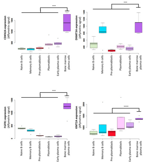 Frequently mutated genes in multiple myeloma (MM) are overexpressed in normal plasma cells. Expression of 4 genes associated with recurrent mutation in MM during B to PC differentiation. Affymetrix microarrays expression box-plots were defined using GenomicScape web tool (http://www.genomicscape.com accessed on 23 July 2021). * indicates a significant difference using Student’s t-test (p ≤ 0.05), *** p ≤ 0.005, **** p ≤ 0.0005.