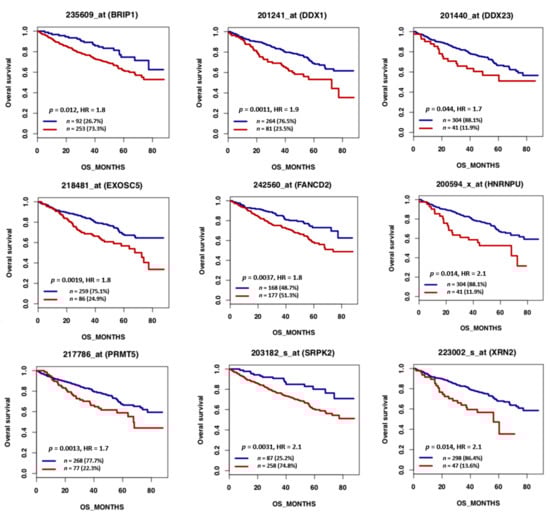 High expression of 9 TRCs resolution genes is associated with a poor outcome in MM patients. Patients of the TT2 cohort (Arkansas, newly diagnosed MM patients treated by High-dose therapy (HDT) and autologous stem cell transplantation (ASCT), n = 345) were ranked according to expression of the TRCs resolution genes and a maximum difference in OS was obtained using the Maxstat R function. Red: high expression. Blue: low expression. Kaplan–Meier curves were defined using GenomicScape web tool (http://www.genomicscape.com accessed on 23 July 2021). HR: hazard ratio.