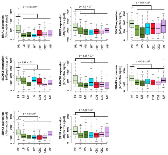 During normal PC differentiation, the prePB stage is associated with a high rate of cell proliferation induced after B-cell activation, with around 50% of cells in S phase. Besides, Ig secretion starts at this stage resulting in strong Ig gene transcription [12,15]. PrePBs are hence exposed to both transcriptional and replication stresses that could enhance the occurrence of DNA lesions due to collisions between replication and transcription machineries. The role of TRCs in cancer has been significantly studied [19,20], however the specific involvement of this process in PC tumorigenesis have never been described. We hypothesized that, particularly at the prePB stage, TRCs have to be carefully managed. First, we sought to identify genes involved in TRC resolution that are significantly overexpressed in prePBs during B-cell to PC differentiation. By reviewing the existing literature, we identified 83 genes involved in TRC resolution (Table S1). Then, we quantified their expression during PC differentiation using our in vitro model and Affymetrix microarray data (data are available at ArrayExpress; http://www.ebi.ac.uk/arrayexpress/ accessed on 23 July 2021, E-MTAB-1771, E-MEXP-2360 and E-MEXP-3034). GenomicScape webtool [21] and multi-class SAM (significance analysis of microarrays) analysis revealed that 41 of these genes were significantly overexpressed in prePBs compared with MBCs, PBs and PCs, with a false discovery rate <5% (Figure 1 and Table S2). Among them, we focused on 38 genes that are described hereafter.