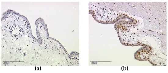 Immunohistochemical staining of retinoid X receptor (RXR) in human placenta tissue, serving as negative and positive control; (a) RXRα-negative control and (b) positive control. (a,b) shows 10× (scale bar = 200 µm) magnification.