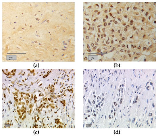 The distribution of tumors, with negative or positive nuclear or cytoplasmic RXRα staining, was analyzed for all tumors. Figure 2 shows immunohistochemically stained RXRα images. Positive stained tissue appeared in a brownish color (Figure 2a–c) and negative or unstained cells appeared blue (Figure 2d). Human placenta tissue was used for RXRα negative controls (Figure 1a) and positive controls (Figure 1b). Tumor staining either appeared negative or positive for both nuclear and cytoplasmic RXRα localizations (Table 1). In cases of RXRα expression in both localizations, a nucleo-cytoplasmic IRS ratio was given (Figure 1b). Correlation analyses show the results of any nuclear or cytoplasmic staining present.