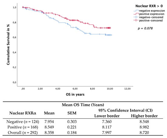 Nuclear RXRα expression in BC tissue samples revealed a trend association with improved OS. The Kaplan–Meier curve visualized a positive association of OS (Figure 3) with the expression of nuclear RXRα. The log rank test yielded a p-value of 0.078 for the OS, which was not statistically significant per our definition. Nevertheless, an obvious trend in terms of a positive correlation of nuclear RXRα expression with OS can be observed. Nuclear RXRα expression showed no significant effect on the DFS (p = 0.914), calculated using the Kaplan–Meier curve and the log rank test. Finally, multivariate Cox regression identified nuclear RXRα as a dependent prognostic factor for OS (HR 0.733, 95%CI 0.487−1.103, p = 0.136) (Table 3).