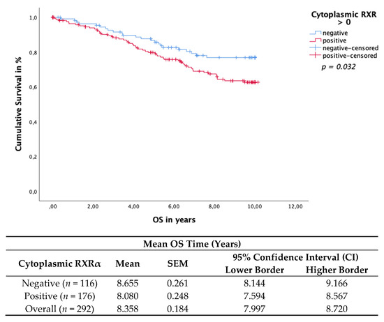 Kaplan–Meier survival analysis assessing cytoplasmic RXRα-positive expression in the Her-2neu-negative patient cohort in relation to OS. Statistical significance is shown as p-values determined using the log-rank-test (p < 0.05). The risk table demonstrates the mean survival.