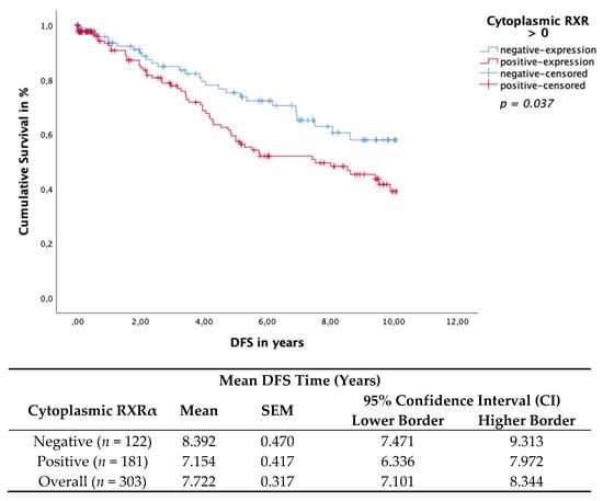 Cytoplasmic RXRα expression in BC tissue samples was associated with impaired OS and DFS. The Kaplan–Meier curve visualized a significant negative association of the OS (Figure 4) and DFS (Figure 5) when expressing cytoplasmic RXRα. A statistically negative significant correlation was observed for the OS (p = 0.032) and for the DFS (p = 0.037), as calculated by the log rank test.