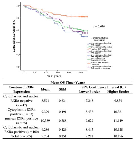 Kaplan–Meier survival analysis of the four combinatorial phenotypic RXRα groups and their expression in relation to OS. Statistical significance is shown as p-values determined using the log-rank-test (p < 0.05). The risk table demonstrates the mean survival time, SEM and 95% confidence interval (CI) for univariate analyses.