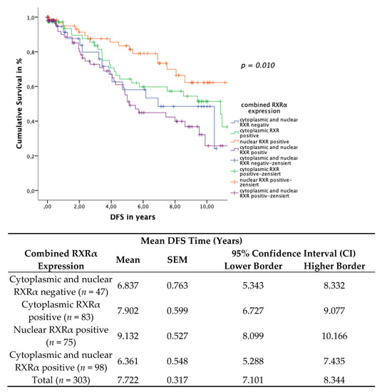 The Kaplan–Meier curve visualized a positive correlation of OS (Figure 6) and a positive correlation of DFS (Figure 7) with the expression of nuclear RXRα only in contrast to the combinatorial RXRα expression groups. The log rank test yielded a significant correlation both for OS (p = 0.030) and for DFS (p = 0.010).