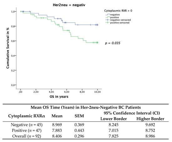 The Her-2neu-negative patient cohort with positive cytoplasmic RXRα BC tissue expression revealed a significant correlation with impaired OS. The TC included 94 patients with a Her-2neu-negative status and 95 patients with a Her-2neu-positive status. The Kaplan–Meier curve visualized a negative correlation of the OS (Figure 8) with the expression of cytoplasmic RXRα in Her-2neu-negative patients. The log rank test yielded a significant correlation for the OS (p = 0.035). Her-2neu-positive patients revealed no significant correlation in relation to survival (p = 0.471). Her-2neu-positive or negative patients revealed no statistical correlation in relation to nuclear RXRα-positive (p = 0.415) or negative (p = 0.351) expression and survival.