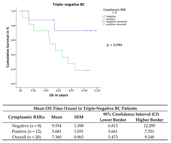 The triple-negative patient cohort with a positive cytoplasmic RXRα BC tissue expression revealed a significant correlation with worse OS. The TC included 20 patients with a triple-negative BC status. The Kaplan–Meier curve visualized a negative correlation of the OS (Figure 9) with the expression of cytoplasmic RXRα in triple-negative patients. The log rank test yielded a significant correlation for the OS (p = 0.044).