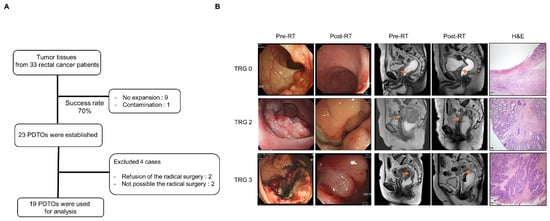Patient characteristics and treatment outcomes. (A) Flow chart indicating the number of patients with rectal cancer, including reasons for non-evaluability, and the success rate of establishing cultures from patients. (B) Pre- and post-RT endoscopic clinical responses, magnetic resonance images. and H&E staining images are shown for TRG 0, TRG 2, and TRG 3 patients. Magnification, ×4. Scale bars, 200 µm Abbreviations: H&E, hematoxylin and eosin; PDTO, patient-derived tumor organoid; RT, radiotherapy; and TRG, tumor regression grade.