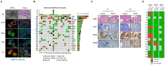 To verify PDTOs, immunostaining was performed using paraffin-embedded organoid sections and tissues. Our PDTOs differentiated into enterocytes (villin 1), goblet cells (mucin 2), and enterochromaffin cells (chromogranin A) and contained amplifying cells (Ki-67; Figure 2A). To analyze the mutational status of the 19 PDTOs, we performed targeted next-generation sequencing analysis using Axen Cancer Panel 2. Variants were filtered based on a multivariate alteration detection of <2%, type of alteration (multi-hit, missense, nonsense, splicing site, in-frame del, and frame-shift), fusion gene, copy number alterations, and functional consequence (pathogenic, likely pathogenic, benign, and likely benign). Genes of the WNT signaling pathway (APC and FBXW7) were mutated in 68.4% (13/19) of all PDTOs. APC and FBXW7 mutations were identified in 13 of 19 PDTOs (68.4%) and 6 of 19 PDTOs (31.5%), respectively (Figure 2B). All mutation alterations are displayed in Supplementary Figure S2. We performed H&E staining and immunostaining of the proteins cytokeratin 7, cytokeratin 20, and caudal type homeobox 2 transcription factor to confirm that our PDTOs originated from rectal cancer tissue and not from normal rectal mucosa. Our PDTOs showed similar histological morphologies and CK protein expression patterns to those of original tumor tissues (Figure 2C). Overall, these data demonstrated that PDTOs recapitulated the histological morphologies and marker expression of the paired patient tissues, as previously reported [21,29]. To define the capacity of colorectal cancer organoids to mirror the genome heterogeneity of the corresponding patient tumor, we compared the mutational status of three genes (KRAS, NRAS, and BRAF) in 19 PDTOs and corresponding tumor tissues. KRAS, NRAS, and BRAF mutations in PDTOs were matched to 86.6%, 100%, and 100% of those in corresponding tumor tissues, respectively (Figure 2D).