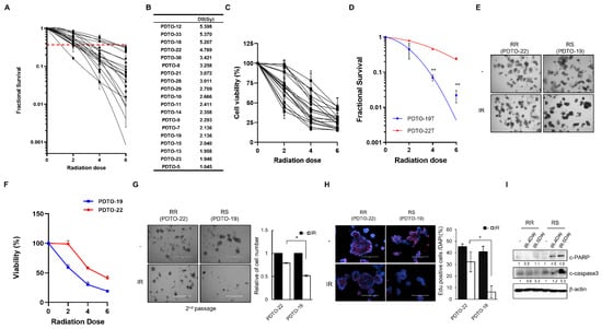To validate the response of PDTOs to irradiation in vitro, we performed a radiation dose-dependent (0 Gy, 2 Gy, 4 Gy, and 6 Gy) survival analysis of 19 PDTOs. Supplementary Figure S3 displays representative images of irradiated organoids, and we counted the number of viable organoids after irradiation to measure the survival fraction (Figure 3A and Supplementary Figure S4). We analyzed the D0 value (the dose required to reduce the fraction of surviving organoids to 37%); a higher D0 value indicates greater radioresistance [26]. Therefore, we defined radioresistant PDTOs and radiosensitive PDTOs according to the D0 value (Figure 3B). These survival fraction data were validated by direct comparison using the MTS cell viability assay (Figure 3C and Supplementary Figure S5). The results demonstrated the heterogeneity of the radioresponse in 19 PDTOs. According to our data, PDTO-22 and PTDO-19 showed radioresistant and radiosensitive characteristics, respectively (Figure 3D,E). To confirm these different radioresponses, we tested this result using several in vitro analyses. The organoid viability of PDTO-19 cells was significantly reduced compared with that of PDTO-22 at 2 Gy, 4 Gy, and 6 Gy (p < 0.0001; Figure 3F). To directly assess the regenerative ability of organoids, we counted organoids at the second passage after splitting the irradiated organoids. Seventy-two hours after splitting, the relative number of PDTO-19 organoids was significantly lower than that of PDTO-22 after irradiation (p = 0.034; Figure 3G). To determine whether the change in cell viability was accompanied by cell proliferation, we performed EdU staining in PTDOs after irradiation and showed that 13% of the cells in the S phase decreased after irradiation in PDTO-22. In contrast, 30% of S phase cells were reduced after irradiation in PDTO-19 (p = 0.029; Figure 3H). To evaluate the apoptotic cellular response to radiation, apoptosis-related protein levels were analyzed. Cleaved-PARP and -caspase-3 levels, which are considered hallmarks of apoptosis, were increased in PDTO-19 after irradiation compared to those in PDTO-22 (Figure 3I).