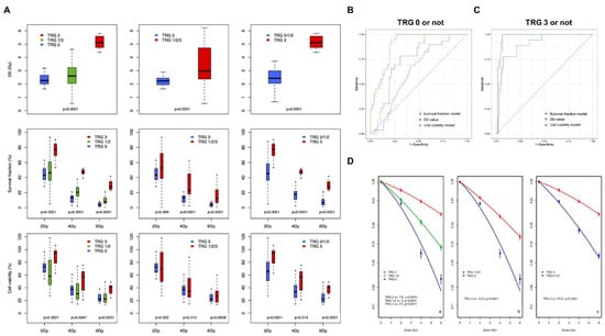 Correlation of experimental data with actual TRG outcomes following patients’ treatments. (A) Comparison of the mean and standard deviation of D0, survival fraction, and cell viability data according to the TRG groups. (B) Receiver operating curve analysis for predicting TRG 0 or not by D0, survival fraction, and cell viability data. (C) Receiver op-erating curve analysis for predicting TRG 3 vs. other using D0, survival fraction, and cell viability data. (D) Compari-son of reconstructed linear-quadratic cell survival curves according to the TRG groups (a), TRG 0 or not (b) and TRG 3 or not (c). Abbreviation: TRG, tumor regression grade.