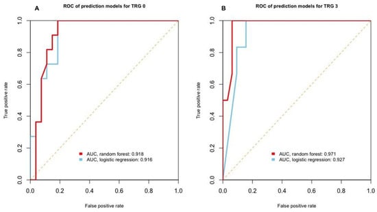 Machine learning-assisted prediction model. (A,B) Performance of machine learning-based prediction models for TRG 0 (A) and TRG 3 (B) on the testing dataset presented using receiver operating characteristic curves and their area under the curves. Red line: prediction model trained using the random forest algorithm, blue line: prediction model trained using binary logistic regression. Abbreviations: AUC, area under the ROC curve; ROC, receiver operating characteristic; and TRG, tumor regression grade.