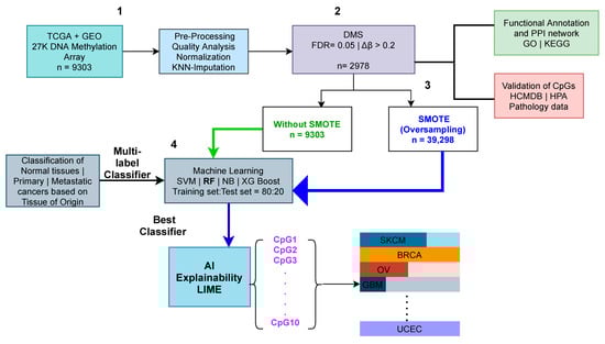 An overview of the workflow used in this study is shown in Figure 2. The workflow consisted of four main components: (i) data acquisition from TCGA and GEO, and preprocessing and quality control analysis; (ii) defining biomarkers for the classification using DMS analysis; (iii) the evaluation of predictive biomarkers using GO, KEGG, and PPI analysis through Metascape [36] and HPA [38]; and (iv) applying machine learning models to classify normal tissue, and primary and metastatic cancer types based on tissue of origin, before and after applying SMOTE, using a multi-label classifier, and interpreting the decision of the classifier using LIME. The results from each of the components mentioned above are described in detail in the following sections.