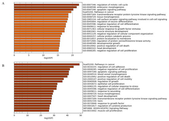 The 2978 CpGs used as prediction biomarkers were annotated to 2737 genes. The top 20 enriched GO and KEGG pathway terms according to Metascape are shown in Figure 4A,B, respectively, and Table S5. The top 20 enriched GO and KEGG pathway terms include the regulation of the mitotic cell cycle, embryonic morphogenesis, the apoptotic signaling pathway, pathways in cancer, the transmembrane receptor protein tyrosine kinase signaling pathway, tissue morphogenesis, the cell surface receptor signaling pathway involved in cell–cell signaling, the regulation of neuron differentiation, the negative regulation of cell differentiation, response to wounding, cellular response to growth factor stimulus, muscle structure development, the negative regulation of cellular component organization, cellular protein catabolic process, protein localization to the membrane, the regulation of protein serine/threonine kinase activity, developmental growth, positive regulation of cell death, head development, and the negative regulation of cell proliferation.