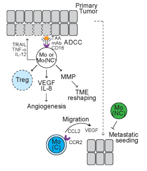 The function of monocytes in tumors. Light blue circles represent human immune cells with pro-tumor function. Dark green circles represent mouse immune cells with anti-tumor function. Dark blue circles represent mouse immune cells with pro-tumor function. White circles represent human immune cells with both anti-tumor and pro-tumor function. Cells with dashed lines represent dead cells. Monocytes (Mo) mediate cytotoxicity of tumor cells through secreting tumor necrosis factor-related apoptosis-inducing ligand (TRAIL), tumor necrosis factor alpha (TNF-α), and interleukin 12 (IL-12) and antibody-dependent cellular cytotoxicity (ADCC). Monocytes promote angiogenesis through upregulating vascular endothelial growth factor (VEGF) and interleukin 8 (IL-8). Monocytes reshape tumor microenvironment (TME) through producing matrix metalloproteinases (MMP). Nonclassical monocytes (Mo(NC)) mediate cytotoxicity of regulatory T cells (Tregs). C-C motif chemokine receptor (CCR2)+ classical monocytes (Mo(C)) are recruited by C-C motif chemokine ligand 2 (CCL2) and promote metastatic seeding by secreting VEGF, while Mo(NC) reduce metastasis. TAA: tumor-associated antigen; mAb: monoclonal antibodies.