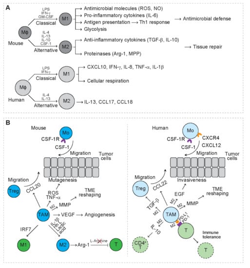 The function of TAMs in tumors. (A) Subpopulations of macrophages in physiological processes. Dark grey circles represent mouse macrophages. Light grey circles represent human macrophages. After classical activation, macrophages (Mϕ) are polarized to M1 macrophages (M1); after alternative activation, macrophages are polarized to M2 macrophages (M2). LPS: lipopolysaccharide; IFN-γ: interferon gamma; GM-CSF: granulocyte-macrophage colony-stimulating factor; ROS: reactive oxygen species; NO: nitric oxide; IL-6: interleukin 6; IL-4: interleukin 4; IL-13: interleukin 13; IL-10: interleukin 10; CSF-1: macrophage colony-stimulating factor; TGF-β: transforming growth factor beta; Arg-1: arginase-1; MMP: matrix metalloproteinases; CXCL10: C-X-C motif chemokine 10; IL-8: interleukin 8; TNF-α: tumor necrosis factor alpha; IL-1β: interleukin 1 beta; CCL17/18: C-C motif chemokine ligand 17/18. (B) Mouse (left) and human (right) macrophages in tumors. Dark green circles represent mouse immune cells with anti-tumor function. Dark blue circles represent mouse immune cells with pro-tumor function. Light green circles represent human immune cells with anti-tumor function. Light blue circles represent human immune cells with pro-tumor function. Cells with dashed lines represent dead cells. Macrophage colony-stimulating factor 1 (CSF-1)/macrophage colony-stimulating factor 1 receptor (CSF-1R) axis mediates recruitment of mouse and human monocytes (Mo) to tumors. C-X-C chemokine ligand 12 (CXCL12)/ C-X-C motif chemokine receptor 4 (CXCR4) axis mediates recruitment of human monocytes (Mo) to tumors. Mouse tumor-associated macrophages (TAM) are polarized to M1 or M2 macrophages depending on TME cues. M2 TAMs inhibit T cell function through upregulating programmed death-ligand 1 (PD-L1) and secreting interleukin (IL-10). TAMs secrete C-C motif chemokine ligand 20 (CCL20) in mice and C-C motif chemokine ligand 22 (CCL22) in humans to recruit regulatory T cells (Treg). Human TAMs secrete TGF-β to enhance Treg function. M2 TAMs express Arg-1 to inhibit T cell proliferation by depleting L-Arginine. Human TAMs secrete epidermal growth factor (EGF) to enhance invasiveness of tumor cells. Mouse and human TAMs secrete MMP to reshape tumor microenvironment (TME). Mouse TAMs secrete vascular endothelial growth factor (VEGF) to induce angiogenesis.