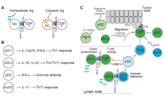 DCs are the most potent antigen presenting cells (APCs), bridging innate immunity and adaptive immunity. DCs are ontogenetically heterogeneous. Some subsets of DCs, such as plasmacytoid DCs (pDCs), conventional DCs (cDCs) and monocyte-derived DCs (moDCs), are originated from common myeloid progenitors (CMPs) expressing fms-like tyrosine kinase 3 (Flt3), macrophage-DC progenitor (MDPs) or circulating monocyes, known as the myeloid origin [70]. Some subsets of DCs, such as pDCs and cDCs, are derived from Flt3+ commom lymphoid progenitors (CLPs) or T cell precursors, known as the lymphoid origin [70]. DCs are phenotypically and functionally heterogeneous under physiological conditions. In response to microbial infection, extracellular microbial proteins are generally phagocytosed or endocytosed by mature DCs and presented through class II major histocompatibility complex (MHC) molecules to CD4+ T cells. In contrast, cytosolic microbial proteins are generally presented through class I MHC molecules to CD8+ T cells (Figure 3A). DCs infiltrated in TME include different subsets of DCs at different developmental stages [71]. The presence of mature DCs in TME is usually associated with favorable prognosis in cancer patients as well as tumor-bearing mice [72,73,74]. These tumor-associated DCs exert immunostimulatory or immunosuppressive effects depending on the subset of DCs and stages of tumors (Figure 3) [71,75].