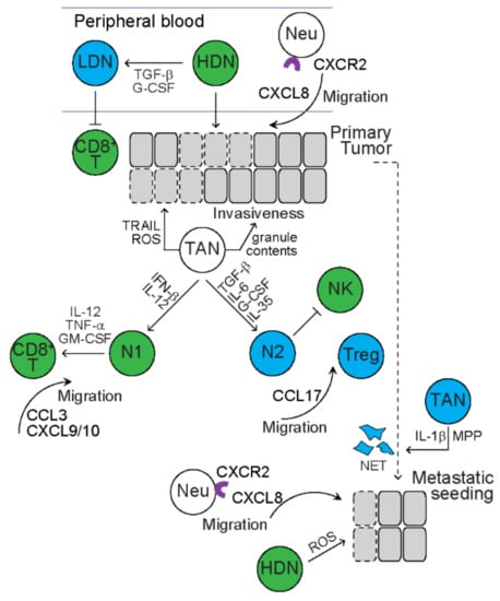 The function of neutrophils in tumors. Dark green circles represent mouse immune cells with anti-tumor function. Dark blue circles represent mouse immune cells with pro-tumor function. White circles represent mouse immune cells with both anti-tumor and pro-tumor function. Cells with dashed lines represent dead cells. Transforming growth factor beta (TGF-β) and granulocyte colony stimulating factor (G-CSF) induce transition of high-density neutrophils (HDN) to low density neutrophils (LDN) with tumor progression. HDN induce cytotoxicity of primary tumor cells and after metastasis, while LDN limit the proliferation of CD8+ T cells. C-X-C motif chemokine receptor 2 (CXCR2)/C-X-C chemokine ligand 8 (CXCL8) axis mediates recruitment of neutrophils (Neu) to primary and metastatic tumors. Tumor-associated neutrophils (TAN) promote invasiveness of cancer cells through releasing granule contents, promote dissemination of cancer cells by secreting interleukin 1 beta (IL-1β) and matrix metalloproteinases (MPP). Neutrophil extracellular traps (NET) promote metastasis through catching cancer cells. TAN mediate cytotoxicity of tumor cells through producing tumor necrosis factor-related apoptosis-inducing ligand (TRAIL) and reactive oxygen species (ROS). TANs are polarized to anti-tumor N1 TANs (N1) or pro-tumor N2 TANs (N2) depending on TME cues. N1 TANs inhibit natural killer (NK) cell function while recruit regulatory T cells (Treg) to TME. N1 TAN secrete chemokines to recruit CD8+ T cells to TME and secrete cytokines to activate CD8+ T cells. IFN-β: interferon beta; IL-12: interleukin 12; IL-6: interleukin 6; IL-35: interleukin 35; TNF-α: tumor necrosis factor alpha; GM-CSF: granulocyte-macrophage colony stimulating factor; CCL3: C-C motif chemokine ligand 3; CXCL9/10: C-X-C chemokine ligand 9/10; CCL17: C-C motif chemokine ligand 17.
