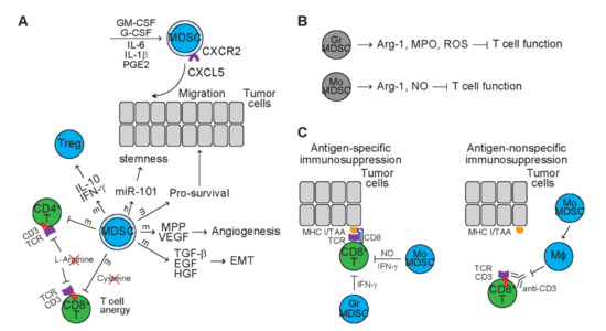 The function of MDSCs and MDSC subsets in tumors. (A) The function of MDSCs in tumors. Dark green circles represent mouse immune cells with anti-tumor function. Dark blue circles represent mouse immune cells with pro-tumor function. Light blue circles represent human immune cells with pro-tumor function. Various cytokines stimulate myelopoiesis, generating myeloid- derived suppressor cells (MDSC). The C-X-C chemokine ligand 5 (CXCL5)/ C-X-C motif chemokine receptor 2 (CXCR2) axis induces recruitment of circulating MDSC to tumor microenvironment (TME). MDSC enhance stemness and survival cancer cells. MDSC also stimulate angiogenesis and induce epithelial–mesenchymal transition (EMT). MDSC suppress proliferation and activation of T cells through depleting L-arginine and cysteine, downregulating CD3 and disrupting T-cell receptor (TCR) function. MDSC also induce regulatory T cells (Treg) through secreting interleukin 10 (IL-10) and interferon gamma (IFN-γ). GM-CSF: granulocyte-macrophage colony stimulating factor; G-CSF: granulocyte colony stimulating factor; IL-6: interleukin 6; IL-1β: interleukin 1 beta; PGE2: prostaglandin E2; MMP: matrix metalloproteinases; VEGF: vascular endothelial growth factor; TGF-β: transforming growth factor beta; EGF: epidermal growth factor; HGF: hepatocyte growth factor; m: mouse; h: human. (B) MDSC subsets in tumor-bearing mice. Granulocytic myeloid-derived suppressor cells (GrMDSC) suppress T cell function through producing reactive oxygen species (ROS). Monocytic myeloid-derived suppressor cells (MoMDSC) suppress T cell function through producing nitric oxide (NO). Arg-1: arginase-1; MPO: myeloperoxidase. (C) Immunosuppression mediated by MDSC subsets. GrMDSC mediate IFN-γ-dependent antigen-specific immunosuppression. MoMDSCs mediate antigen-specific immunosuppression that is required for IFN-γ and NO (left panel). MoMDSC-derived macrophages (Mϕ) mediate antigen-nonspecific immunosuppression. MHC I: class I major histocompatibility complex; TAA: tumor-associated antigen.