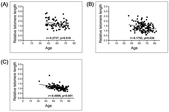 Linear correlation of RTL with age in normal control (NC), bladder cancer (BC), and renal cell carcinoma (RCC) groups: (A) NC group (n = 73); (B) BC group (n = 144); (C) RCC group (n = 144).