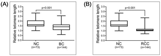 Comparison of RTL: (A) normal control (NC) group (n = 73) versus bladder cancer (BC) group (n = 144); (B) NC group (n = 73) versus renal cell carcinoma (RCC) group (n = 144). Comparisons were performed using Mann–Whitney test.
