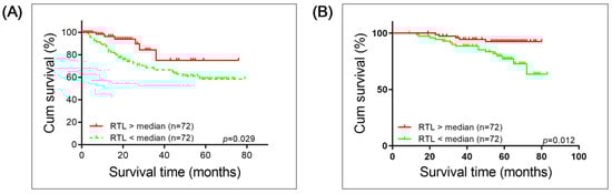 Kaplan–Meier survival analysis with a log-rank test was applied to investigate whether long or short RTL correlates with OS prognosis of patients with BC or RCC. Both groups of patients with short RTL had worse survival compared to those with long RTL (BC: p = 0.029; RCC: p = 0.012; Figure 3).