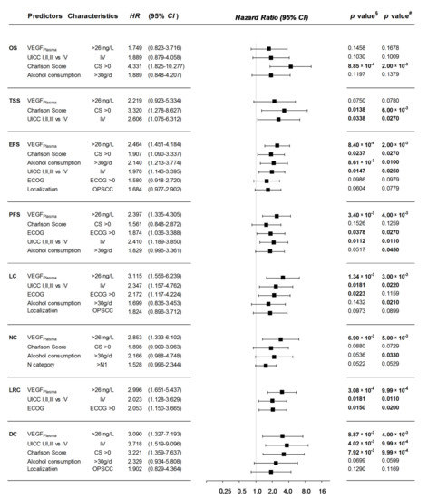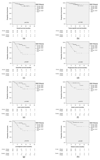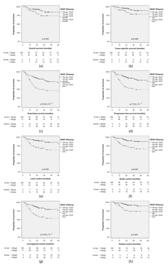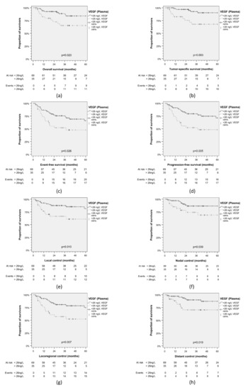 - Kulapaditharom, B.; Boonkitticharoen, V.; Sritara, C. Plasma vascular endothelial growth factor dysregulation in defining aggressiveness of head and neck squamous cell carcinoma. J. Oncol. 2012, 2012, 687934. [Google Scholar] [CrossRef] [PubMed] [Green Version]
