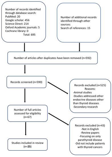 The process of article selection is illustrated in Figure 1. The database searches retrieved 695 articles, and a reference list search retrieved 15 additional studies. After deduplication, 590 articles were screened, of which 67 full articles were retrieved. A total of 25 studies met the inclusion criteria. Overall, the outcomes of nearly 3000 patients were described. All included studies were published between 2016 and 2021, and the mean ages of the included participants ranged from 39.2 to 61.6 years for 22 studies, while three studies did not report the ages of their participants. Two studies reported age ranges (32–70 and 34–73 years, respectively) [42,43]. Five studies were retrospective, and seven studies had a control group. Three studies exclusively evaluated patients with thyroid cancer, whereas the remaining studies assessed patients with thyroid cancer and other thyroid or parathyroid diseases. The study characteristics of the included studies are presented in Table 1.