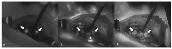 A sequence of images showing ICGA of two PGs (arrows) from A to C. (A) Autofluorescence of the PG before the injection of ICG. (B,C) Diffusion of the ICG contrast agent confirming a well-vascularized PG (Fluobeam LX®—Fluoptics©, Grenoble, France).