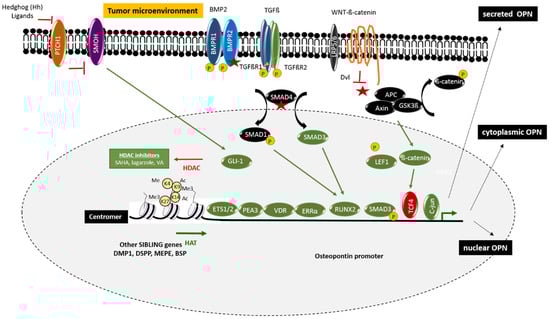Epigenetic regulation can also be mediated by the methylation and/or acetylation of histone tails, thereby altering the chromatin structure. Epigenetic regulators that regulate the transcriptional activity of OPN have mostly been investigated in the context of osteogenic differentiation [14]. However, a few publications have studied the epigenetic regulation of OPN in the context of cancer. Different histone deacetylase (HDAC) inhibitors have been tested and were shown to regulate OPN expression. Among them, suberoylanilide hydroxamic acid (SAHA), largazol, and valproic acid were all capable of up-regulating OPN. The up-regulation of OPN was associated with HDAC2 and/or HDAC8 inhibition, resulting in both increased acetylation of H3 (H3K9 and H3K14) and increased methylation of H3K4 in the OPN promoter [18,19,20,21,22]. Glucose may act as a potent inducer of histone acetylation and methylation, which in turn leads to upregulation of the OPN gene expression [23]. Additionally, the KDM6B histone demethylase promotes osteogenic commitment by removing the epigenetic H3K27me3 marks from the promoters of osteogenic genes, including OPN [24]. In contrast, the decrease of the OPN promoter activity in multipotent mesenchymal cells is associated with the enhancement of HDAC and H3K9 trimethylation [25].
