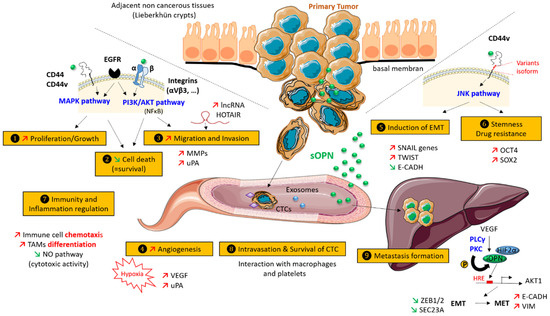 Role of OPN in CRC progression. OPN is involved in cancer progression by regulating various aspects of tumor progression and metastasis, including (1) increased proliferation and cell growth, (2) decreased cell death, (3) increased migration and invasion, (4) neo-angiogenesis, (5) promotion of the epithelial-mesenchymal transition (EMT), (6) increased stemness and drug resistance, (7) modulation of immunity and inflammation both at the primary and metastatic sites, (8) intravasation and survival of circulating tumor cells (CTC), and (9) promotion of liver metastasis. sOPN—secreted OPN; iOPN—intranuclear OPN; MET—mesenchymal to epithelial transition; HRE—HIF response element.