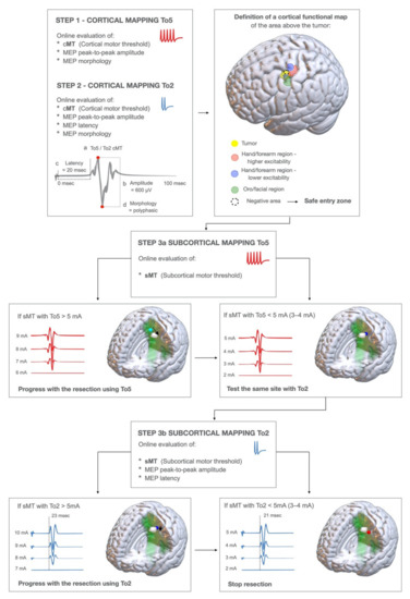 In each area of interest, subcortical mapping aimed at identifying fibers with different functional properties coherent with the cortical components, to guide the identification of resection borders. Both HF-To5 and HF-To2 were continuously applied (catodal set-up) to identify the different fibers originating from M1 components. To ensure a continuous subcortical mapping, the monopolar probe was kept by the assisting surgeon in the surgical field, very close to the site of resection, in order to detect any motor response. Upon identification of a motor response, a current-intensity-curve was always performed to find the sMT, allowing for a reliable estimation of the distance from M1 corticofugal fibers. The same parameters estimated at the cortical level were used subcortically to infer to which of the two cortical components the fibers stimulated could be ascribed: the muscle pattern of MEPs, Motor-Threshold intensity, MEPs amplitude and latency. The HF-To2 MEPs amplitude and latency were calculated on-line (Figure 1, Step 3a–3b). Technically, mapping was initially performed with HF-To5, with the current intensity set at 10 mA. When a stable MEP was found, the current intensity was progressively decreased to find MEPs at threshold-sMT, at each site: when a MEP was evoked with sMT < 4 mA, stimulation was shifted to HF-To2, to find the corresponding sMT (expected to be higher than HF-To5 sMT, given the lower number of pulses). When HF-To2 evoked a MEP with intensity < 5 mA, then MEP latency, amplitude and morphology were assessed, and the intensity decreased until sMT (3–4 mA), set as the intensity estimating the minimum safe distance to the essential fibers defining the limit of resection.