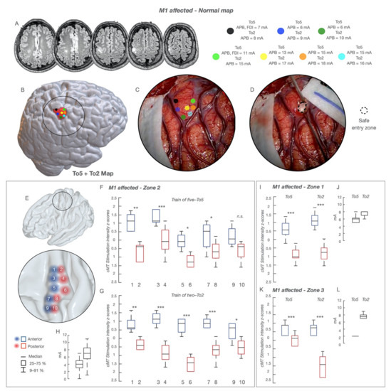 “Normal” functional cortical map in the group of 66 patients with tumors within M1. The functional cortical map is presented in a representative case of glioma involving the non-dominant hand-knob; the lesion is visible in (A), sequential axial FLAIR images, as a poorly defined mass (low-grade glioma) involving the hand-knob region of M1. The cortical area exposed (circle line), the sites stimulated with HF-To5 and HF-To2 (colored dots) and the tumor area (pink volume) are reconstructed in an NMI space and shown in (B). The picture of the intraoperative field along with the location of the stimulated sites (colored dots) superimposed to the surgical field is shown in (C). The entry point where the resection was started is shown in (D) as a dotted circle. For each dot, the cMT (quantitative parameter) at HF-To5 and HF-To2 and the pattern of muscle activated (qualitative parameters) are reported; when the same sites were stimulated with HF-To2, only APB MEPs were evoked at the anterior bank (cMT 15–17 mA) and at the posterior one (cMT 8–10 mA). A clear functional segregation was documented between the anterior (lower excitability) and posterior (higher excitability) regions. The safe entry zone (D) corresponded to the area of lower excitability. (E) The hand-knob region was divided based on 10 stimulated sites (1,3,5,7,9 covering the anterior region—red circles; 2,4,6,8,10 covering the posterior region—blue circles); in each site the cMT (absolute value, mA) at HF-To5 (F) and HF-To2 (G) was normalized within the subject (Z-score) to allow for a comparison between the anterior and posterior regions with each paradigm. The same procedure was applied for the other body division, lower limb (zone-1) (I) and face (zone-3) (K). cMT are expressed as 25–75% median (rectangle) and 9–91% (edge of the box), along with the delta (H,J,L); * p < 0.5; ** p < 0.01; *** p < 0.001.