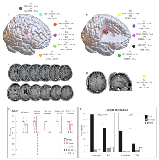 Functional Maps and Resection. A case of glioma involving, in the non-dominant hemisphere, the vPM and the face area of M1 (zone-3), in a representative patient who experienced several left face focal seizures. The location of the tumor is shown in (C) (sequential axial post-GDT1-weighted images); the tumor appeared as a solid, well-demarcated mass with contrast enhancement nodules. The patient was submitted to a sleep surgery with the aid of the advanced brain mapping technique. A cartoon depicting, in the NMI space, the cortical functional map is shown in (A). The tumor volume is in pink. The stimulated sites are shown as colored dots. At the cortical level, HF-To5 and HF-To2 evoked face (Mentalis and Cricothyroid) MEPs at variable cMT (To5 ranging between 6 and 13 mA; To2 ranging between 7 and 18 mA) with a clear functional segregation between the anterior and posterior regions. At the subcortical level (B), sites evoking hand or face muscle MEPs at the lowest sMT were identified. Those with the lowest sMT at HF-To5 and HF-To2 (yellow, blue, black and dark green) were used as the margin of resection; sites with the lowest sMT at HF-To5 but with sMT at HF-To2 > 4 mA (representative site indicated by a magenta dot) were removed. The post-operative MR is shown in (D) (sequential axial post-GD-T1 weighted images). A representative location of a functional site identified by subcortical mapping is shown at the posterior and inferior margin of the tumor as a colored yellow dot, superimposed to the preoperative axial and coronal post-GD-T1-weighted images. HF-To5 evoked MEPs of Mentalis and Cricothyroid at an sMT of 2 mA; HF-To2 evoked only cricothyroid MEPs at an sMT of 3 mA, indicating that these fibers belong to the posterior functional component. A histo-molecular diagnosis showed a grade-III IDH-wildtype glioblastoma, TERT Intact. (E) Action-Research-Arm-Test (ARAT) evaluation score performed in the group of patients with tumors involving the hand-knob region of M1; the pre- (preop) and post-operative (45 days of surgery) (postop) scores are presented for the whole group (all patients), patients with normal cortical map, patients with normal subcortical map, patients with distorted cortical map and patients with distorted subcortical map. Scores are presented as 25–75% median (rectangle) and 9–91% (edge of the box). (F) Comparison of Extent of resection achieved in the 66 patients with tumors involving M1, in whom resection was guided by the advanced motor mapping technique (Advanced) and in the 51 patients with similar tumors, in whom resection was guided by the traditional To5 motor mapping technique (To5); the same comparison is presented for patients with low-grade gliomas (LGG); data are expressed as EOR classes: Total resection, subtotal, or partial; * p < 0.5; ** p < 0.01.