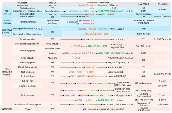 Classification of proteins from the DNA repair processes according to the DNA damaging agents, the type of DNA damage in relation with recruited effectors, repair mechanisms, and cell cycle phases occurrence or induced arrests. DNA damaged proteins are classified as sensors (violet), transducers (orange), mediators (green), and effectors (black). Natural processes, showed in the upper blue part, display a non-canonical DDR. They inhibit effectors, restrain the DNA repair in mitosis and protects telomere ends (inhibited proteins in red). Canonical DDR pathways are shown in the pink lower part.