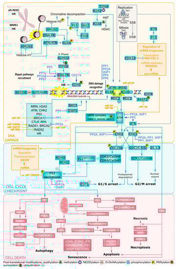Regulation of the DNA damage signaling network of proteins. In the yellow panel: after DNA damage, induced for example by topoisomerases misregulation, repair pathways are selected, and major sensors/effectors are recruited to the damaged lesions. These recruitments are accompanied by many post-translational modifications of proteins with major impacts on the cell response to DNA damage, e.g., O-GlcNAcylation of H2AX and NDC1 at the DNA damage repair site, ubiquitination and NEDDylation of Ku70/80 from the NHEJ and/or PARylation of NBS1 in the MRN complex from HR, and sumoylation of TIP60 in HR. The chromosomal state and the regions damaged mobilize different repair processes that are facilitated by chromatin decompaction through the action of HMGN1 on histone H3, histones methylation/acetylation, and ING proteins (e.g., ING2) action on phosphorylated P53. Topoisomerases misregulation induces persistent DNA breaks. The cell cycle phase controls the selected DSB repair process: HR acts in S phase. CDH1, a cofactor of APC/C (anaphase-promoting complex/cyclosome, a multi-subunit E3 ubiquitin ligase) involved in cyclin degradation, is activated by CDC14 and by DNA damage in G2, while normally inactive. CDK12 represses transcription by inhibition of RNA POLII (polymerase II). The replication factor CDT1 is proteolyzed in G1 providing a checkpoint control to avoid replication. In the blue panel: early signaling by PI3K (ATM, ATR, and DNA-PK) activates secondary kinases. CHK1 and CHK2 lead to cell cycle checkpoint regulation and arrest the cell cycle, respectively, in G2/M after CDC25C inactivation and G1/S after CDC25A inhibition. Another PI3K, PTEN, triggers cell death. Phosphatases tightly regulate phosphorylation at several levels of the signaling cascades, and counter-balance kinases. Recruited repair effectors, such as ATM, regulate miRNA biogenesis (orange) at the transcriptional and post-transcriptional levels. In return, miRNAs regulate other components of the signaling pathways. RNA/DNA hybrids facilitate the recruitment of DDR effectors to DSB. In the red panel: different cell death processes are triggered by different pathways. P53 oscillations initiate a caspase cleavage cascade and apoptosis, while the inhibition of the mTORC1 complex directs the cell outcome to autophagy. Levels of ATP and NAD dictate necrosis and senescence, and activation of the RIP3 kinase conducts to necroptosis. Senescence is only triggered when P21, P16, and CDK4/6 are activated with IFN-associated inflammatory background and results in the secretion of SASP (senescence-associated secretory phenotype) factors.